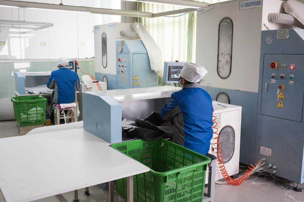 充绒是将羽绒填充到羽绒服的各个部分,这一步骤对羽绒服的保暖性能至关重要。充绒时需要控制好羽绒的分布,确保每部分的保暖效果均匀。