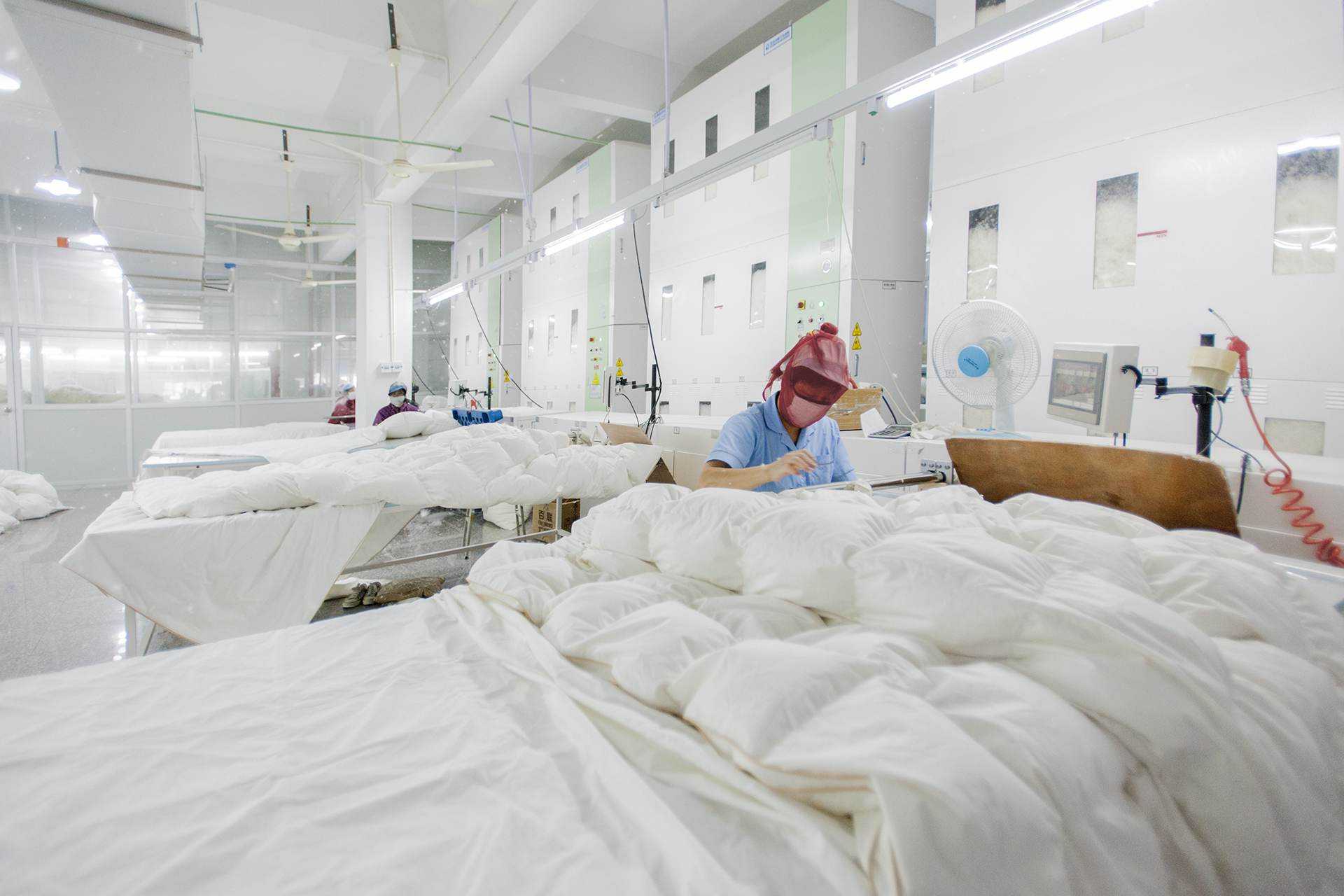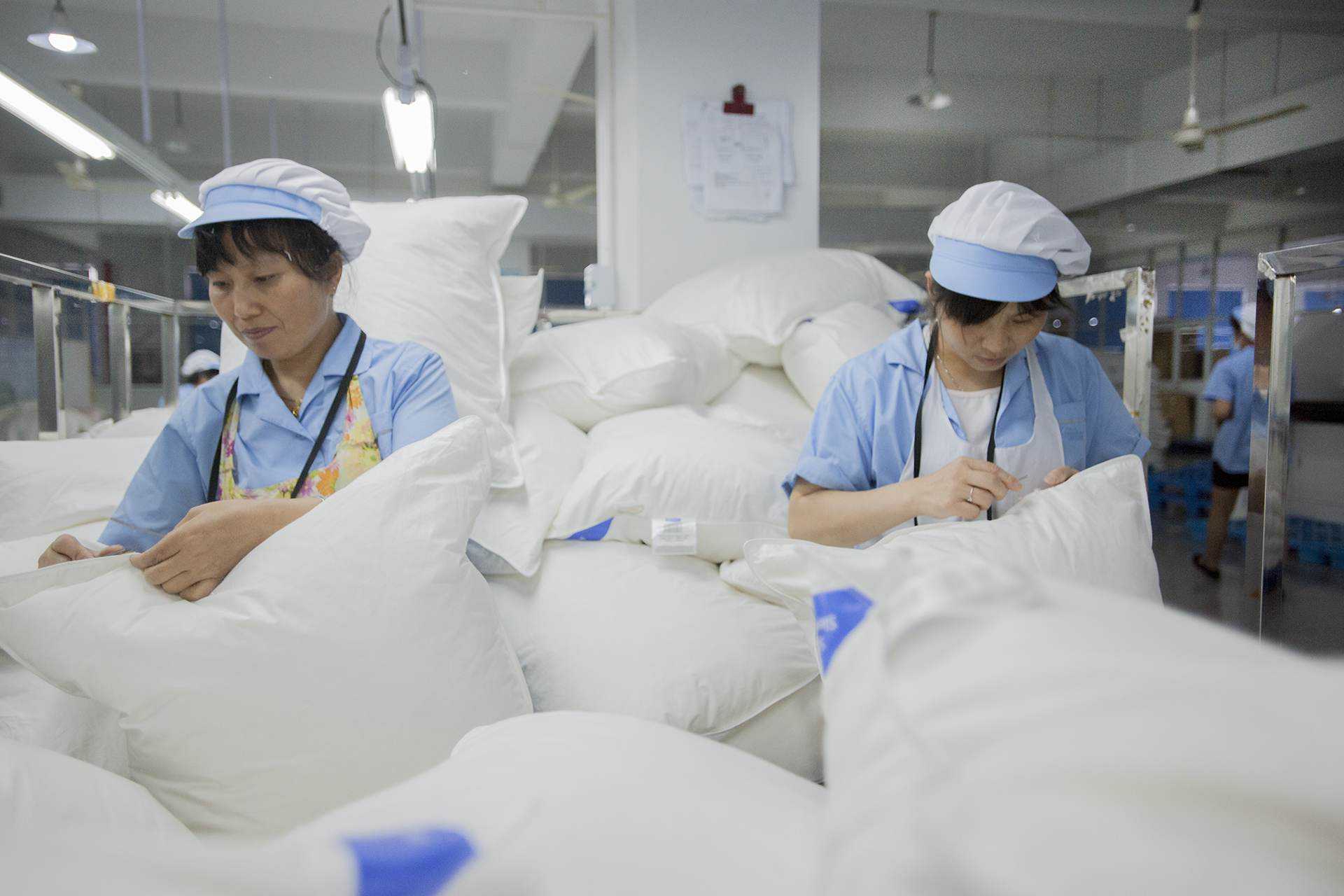 充绒是将羽绒填充到羽绒服的各个部分,这一步骤对羽绒服的保暖性能至关重要。充绒时需要控制好羽绒的分布,确保每部分的保暖效果均匀。充绒袋做好了,就要往里面充绒了,每个部位的充绒量根据已经设计好的充绒量化表进行操作,这就需要两个工人协作完成。